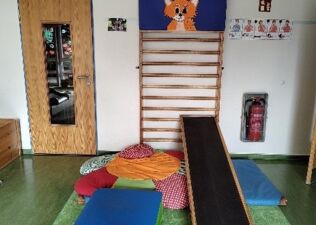 Die Kinder sind viel an der frischen Luft und spielen auf dem großzügigen Außengelände. In den Gruppenräumen selbst ist viel Platz für Bewegungsspiele, Angebote auf dem Boden und Mal- und Bastelangebote. Das Spielmaterial ist dem Alter und den Bedürfnissen der Kinder entsprechend abgestimmt und in Kinderhöhe angeordnet.